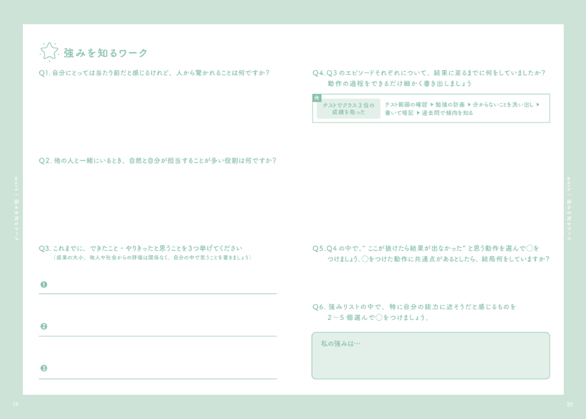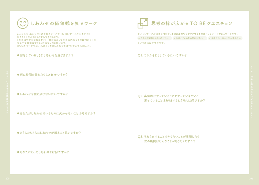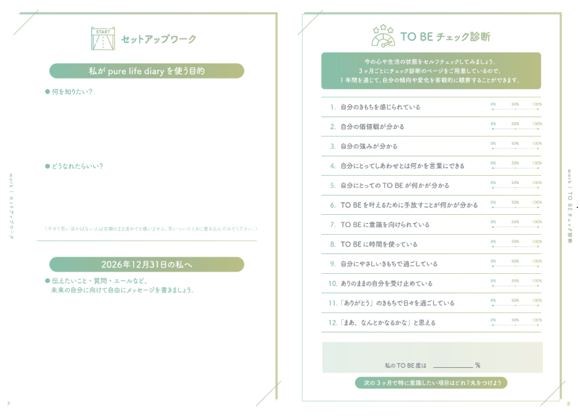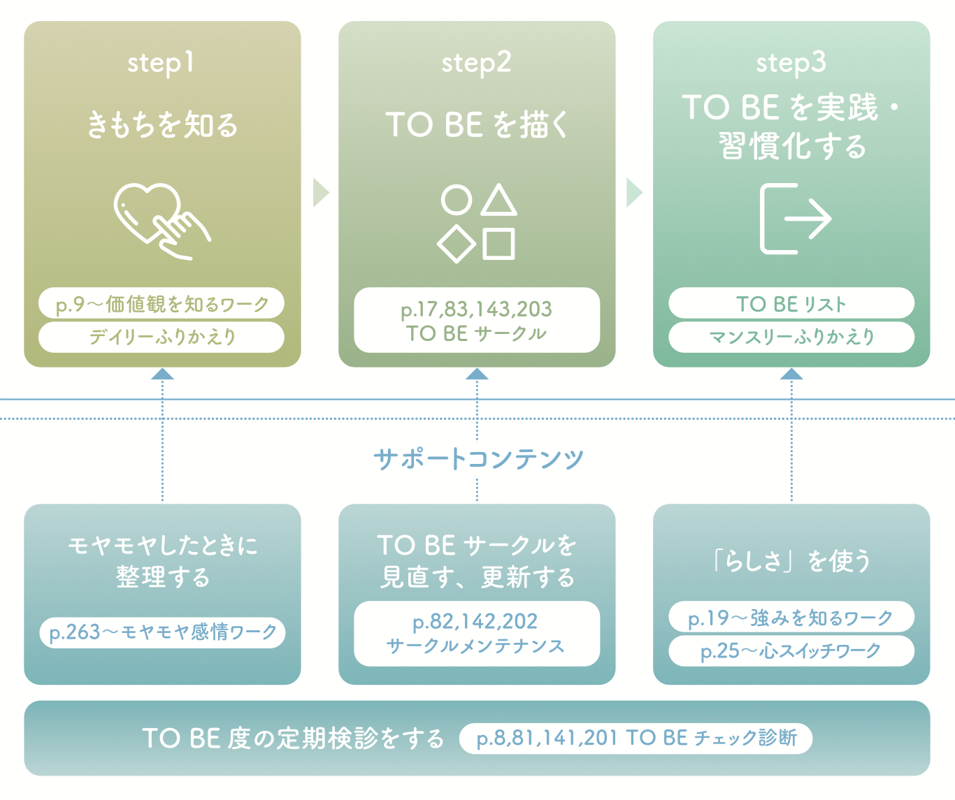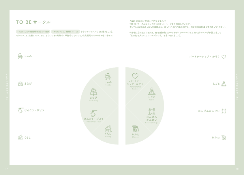 自分にとって大切な時間の使い方・実はやりたいと思っていたこと・本当は好きなこと・これから挑戦したいことなど、「あなたにとってのTO BE」を8つのジャンルで自由に書きます。内容は変わってもOK!計4回分ページを収録しているので、何度でもメンテナンスしましょう。