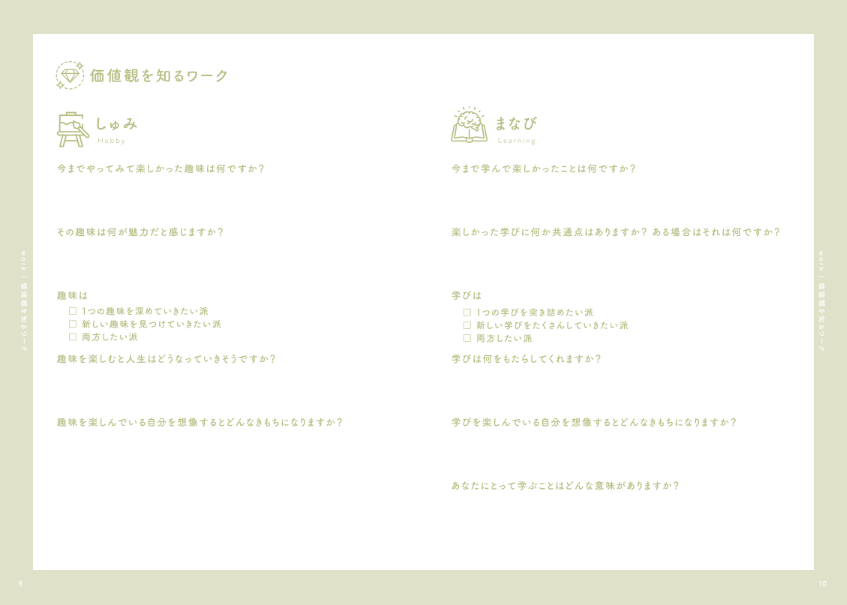 価値観ワークでは、ジャンルごとに好きなことや大切にしたいことが言語化できます。