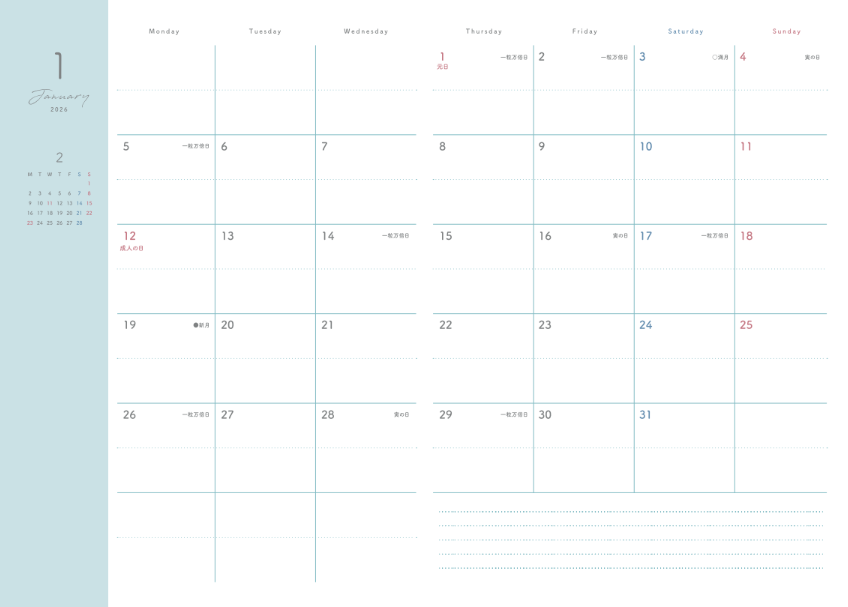ふりかえりをたくさん書き込みたいときなど、自由にメモスペースとしてお使いいただけます。ユーザーのみなさまからのご要望を受けて、マンスリーページとセットでメモページを収録する他、巻末にもたっぷりご用意しました。