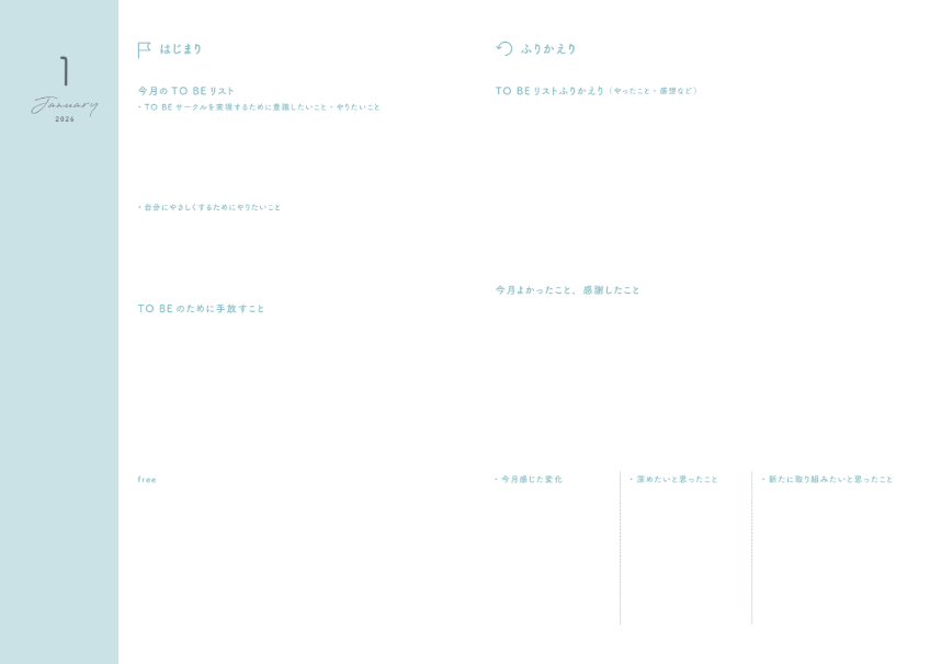 TO BE サークルに書いたことを実現していくために、 月初に今月やりたいTO BEリストや手放すことを書きます。またTO BEリストをやってみた感想やよかったことなどを書き出して1ヶ月をふりかえることができます。