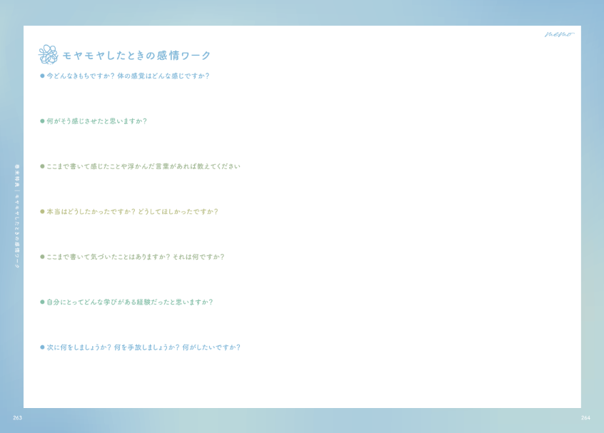 本当に大切なのは自分にやさしくなってありたい自分に少しずつ変化していくことなので、”ちゃんと書く”必要はありません^^(開発者も毎日書いていませんし、空欄のままのワークもあります)ガイドブックや解説動画なども参考にしながら、ご自身のペースで楽しんでください。